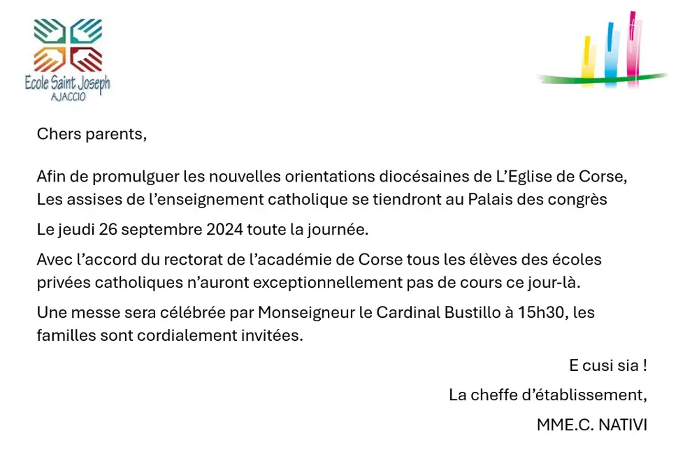 Cari famiglie, vi ringraziu per u vostru impegnu in a riescita di I vostri zitelli