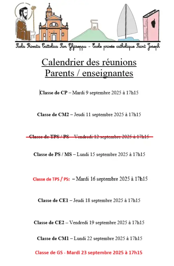 Veuillez noter que la réunion pour la classe de TPS/PS initialement prévue le vendredi 12 septembre est reportée au mardi 16 septembre 2025 à 17h15, la réunion de GS se tiendra le mardi 23 septembre 2025 à 17h15.